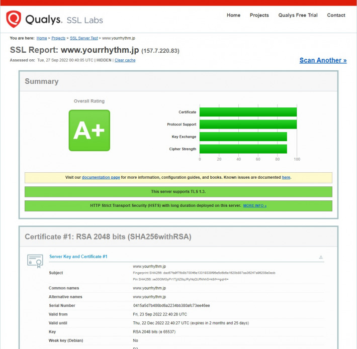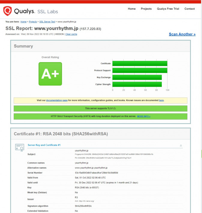 ※ホームページ作成を目的としたレンタルサーバーで設定されたSSLの安全性を確認すると、良くて評価は「A」が上限かと思います。ユアリズムではサーバーOS(Linux)の設定からWebサービスの構築と設定、WordPressの導入に至るまで全て自分で行っているので現実的には最高値のA+に上げられています。