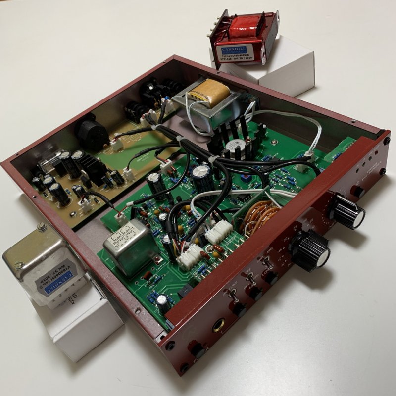 基盤を外し、インプットトランスを交換します。基盤は最初からCarnhillに交換する前提になっているので元のトランスを外して交換するだけです手前に散らばっているのは吸い取った元のハンダです。
