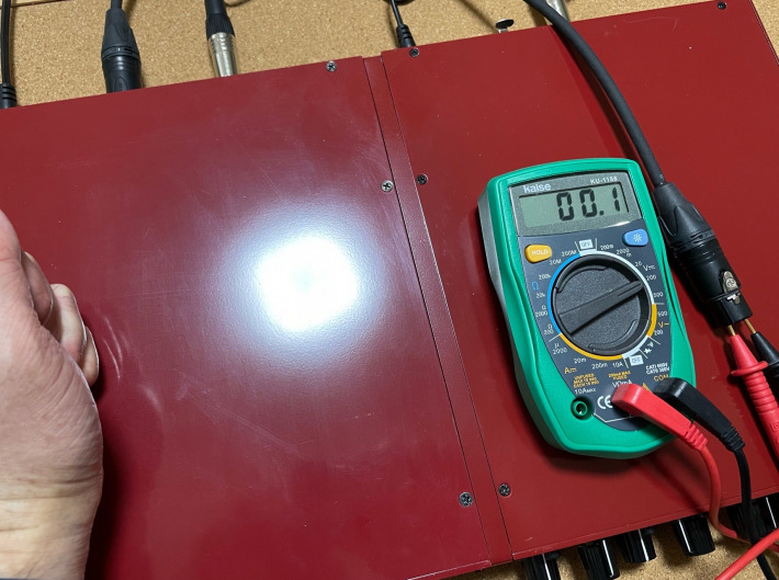 マイクに繋ぐXLRケーブルでファンタムが送られているかテスターで調べると0Vでした。何か配線外したかな?とラックから外し調べましたが、問題なく電圧が掛かります。