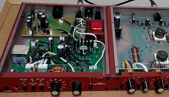 マイクプリ本体の天板を外して交換していきます。赤いトランスはヤル気が出ますね