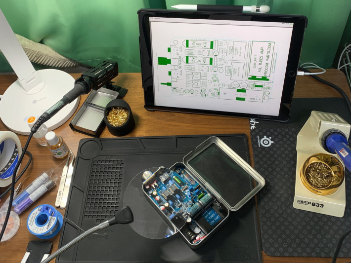 悪戦苦闘の末、なんとか完成しました。はんだごてを2台使い、一台はチップ抵抗用のこて先(1mm)もう一台はちょっと太めのこて先のを用意するとヨチヨチながらもスムーズに作業を進めることができました。かなりの部品数ですが、丁寧なマニュアルのお陰で迷うことなく作業できました!ノイズも無く、真空管を軽く弾くと聴こえる、風鈴の音色のようなマイクロフォニック雑音が聴こえたときは感動しました!(達成感)
