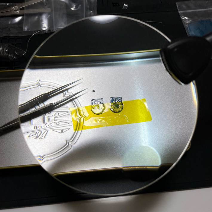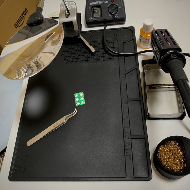 そもそも1mmのコテ先を使うはんだ付けというのをしたことが無かったので、温調はんだごてやら作業マットやらルーペやら必要な工具を取りそろえ、まずは練習用のLED基盤を買って、ルーペを使いひたすら練習しました。
