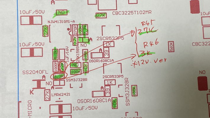 PROCOM様よりMUSES05は駆動電圧を高めにしないと効果が見えづらいとの事で、オペアンプの駆動電圧を±11Vから±12Vに変更する提案を受けました。変更する抵抗についてご指示を頂きましたが、今回はPROCOM様に改造をお願いしました。