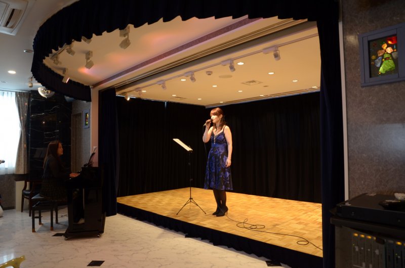 現場に行ったら、やっぱりワイヤレスの会議用ミキサーで、丸スピーカーがいくつか天井に埋め込まれてました😱ピアノは本体で、ヴォーカルはVE-5でリバーブ掛けています💦