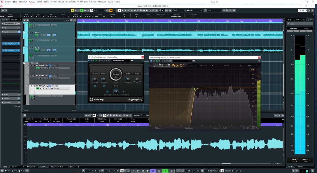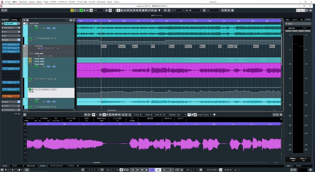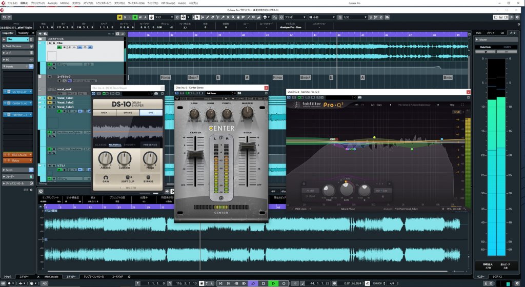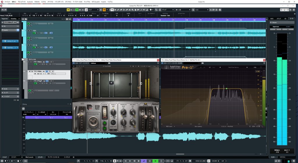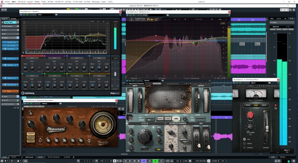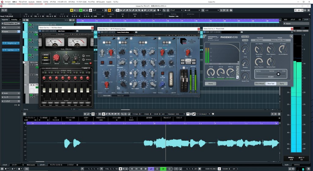 ウチの定番になりつつある、RX7 De-ess~Cubaseの8バンドEQで調整して、T.マセラッティのヴォーカル向けプラグインで盛ってダイナミックEQで補正後、コンソールシミュレータで少し倍音を加えるパターンですが、今回は最終段にチェンバーリバーブを薄く掛けました。