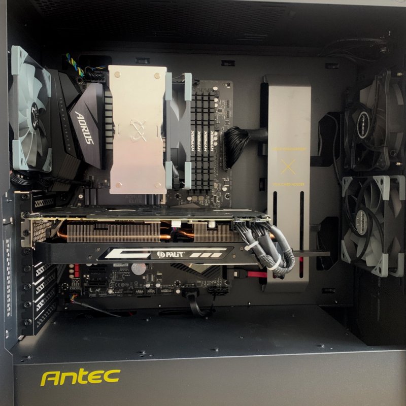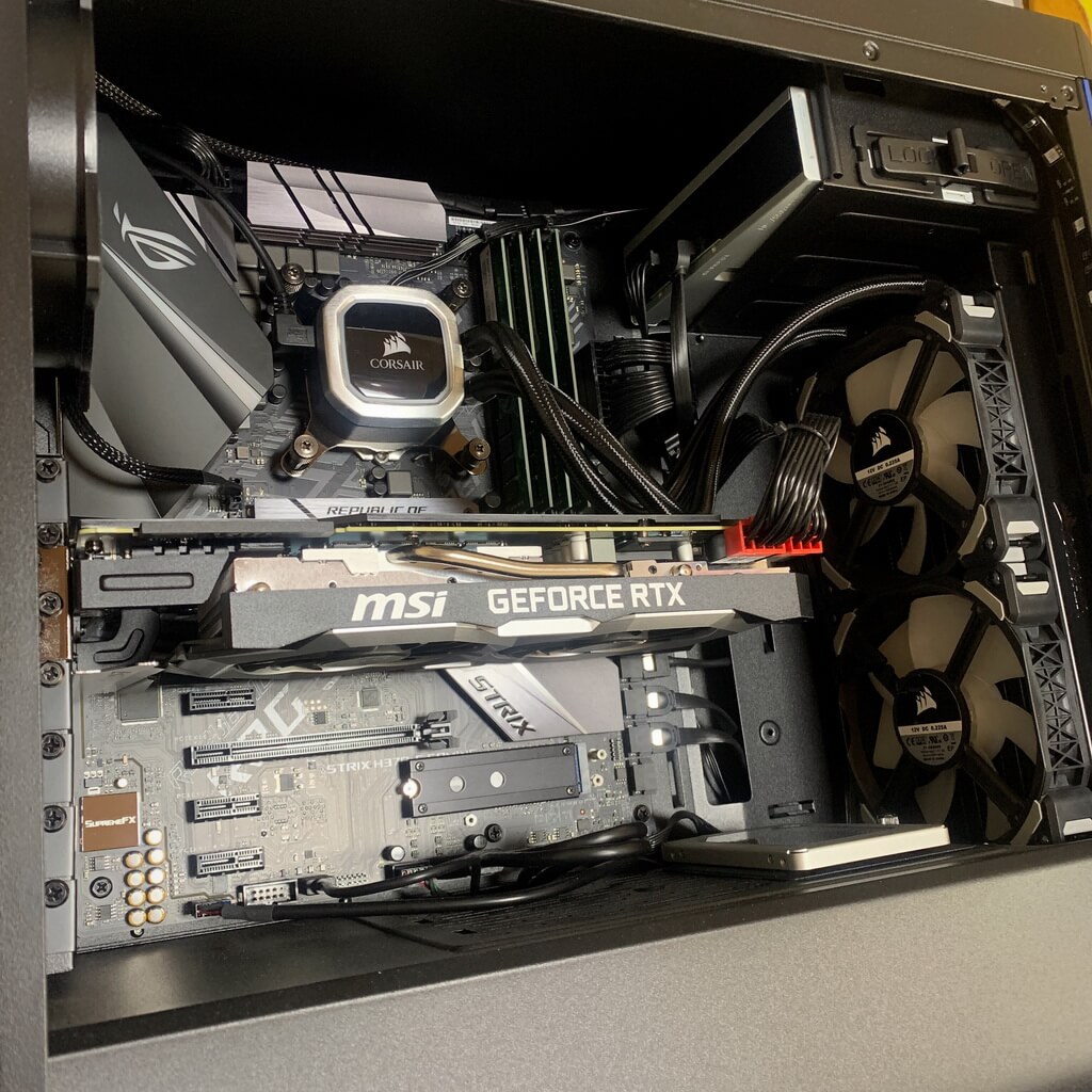 インテルのCore i7-8086kを240mmの簡易水冷(CORSAIR H100i RGB PLATINUM)で組んだものがこちらです。同じATXマザーですが省スペースなケースに押し込んでいるのでキツキツです(;’∀’)