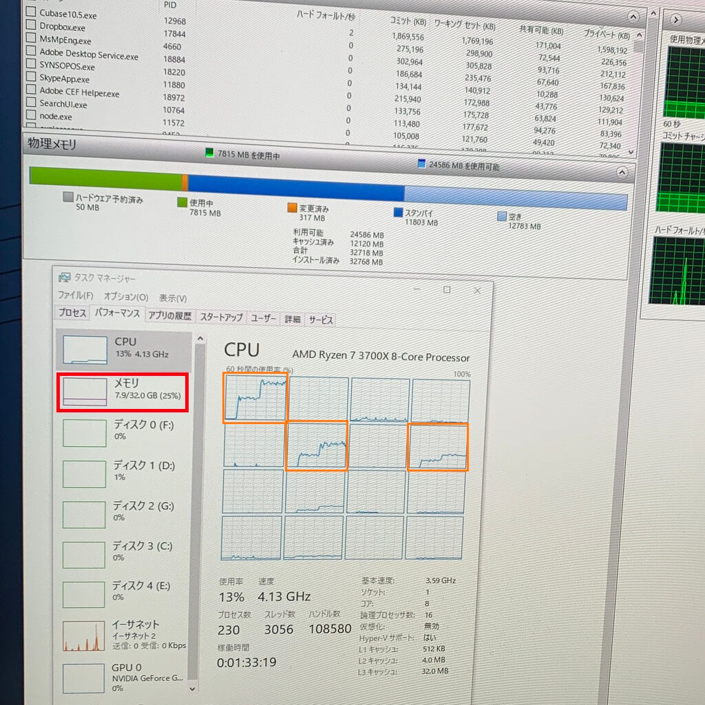 下のタスクマネージャーは2mixのオーディオミックスダウンを行った時のスクリーンショットです。