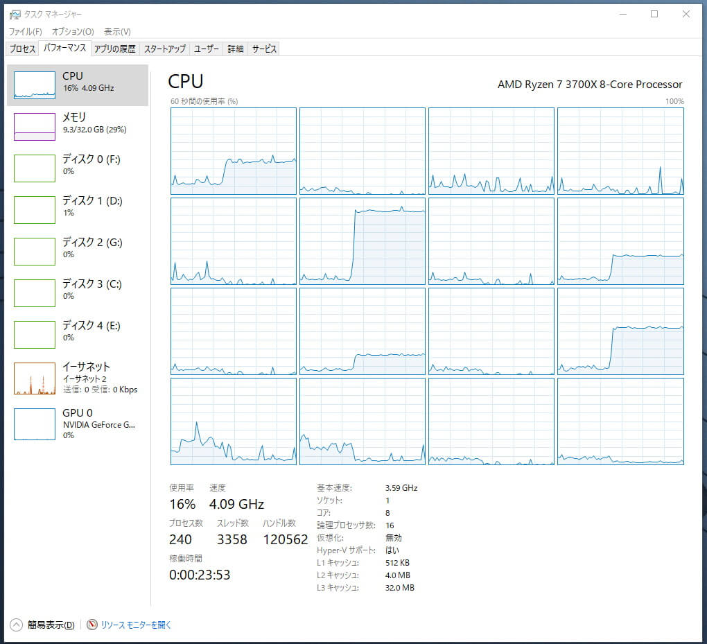 Ryzen 7 3700Xはベースクロックが3.60GHzですが、全コア(~4.40GHz)で稼働します。