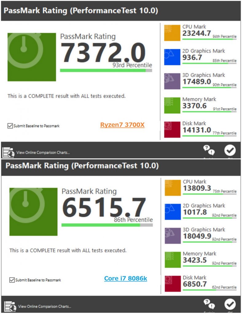 総合パフォーマンス計測ソフトのPassMarkで比較してみました。上が3700Xで組んだマシン、下が8086kで組んだマシンです。