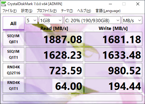 かなり値段を抑えた構成ですのでビックリするような値が出るわけではありませんが、ストレージの速度も確認していきます。最近はNVMeというタイプのSSDが二個載せられるマザーボードが多いです。普通の2.5inch-SSDとNVMeタイプのSSDは速度が全く違いますのでその辺りを見ていただければ・・・と思います。