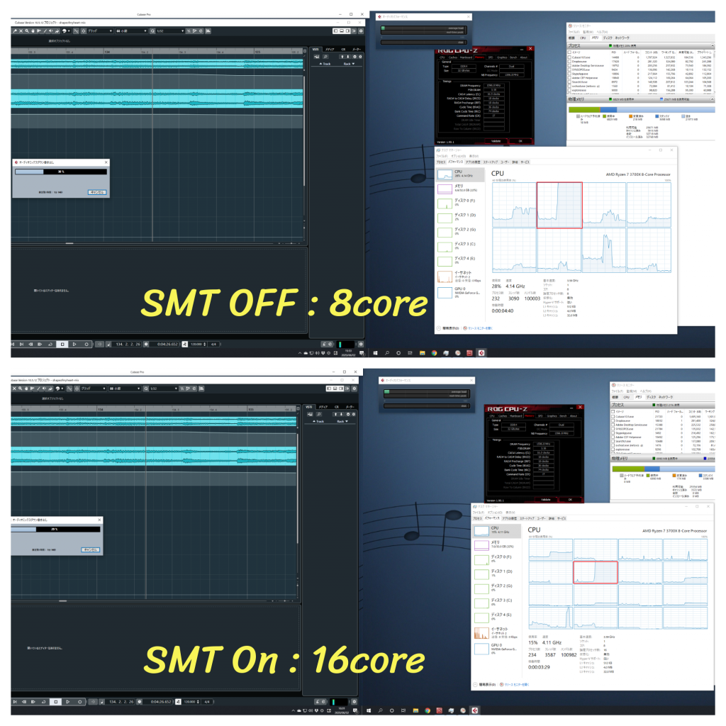 でした。ストップウォッチで計っているので多少誤差はありますが、少なくともCubaseにおいて論理コアを減らして恩恵があるようには見えません。