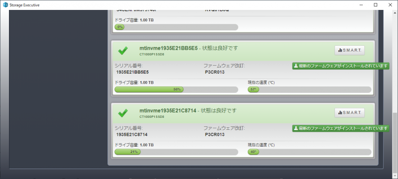 また、ユーティリティで温度情報などが取得できますが、マザーボードの上側のM.2スロットには大抵ヒートシンクが付いていますが下側のスロットには付いていない事が多いです。私はヒートシンクのみ付けていますが、上のベンチ後の温度は、下段57℃、上段40℃と、下段の方が17℃ほど高いので、これも速度低下の一因になっているかも知れません。(ユーティリティで上に表示されているのが、マザーボード下段に付けたSSDです)
