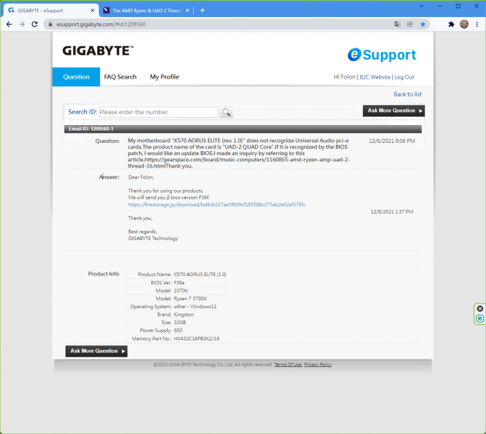 Gigabyteのサポートにチケットをあげて二日ほどで回答をいただき、そちらにβ版BIOSのダウンロードリンクがありました。