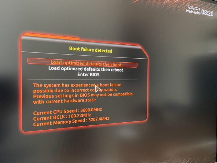 起動シーケンス中に躓く件をサポートに伝えたところ、「今のプロファイルを送ってください」と言われ、BIOSでプロファイルファイルをUSBメモリに書き出して、送ったところ、