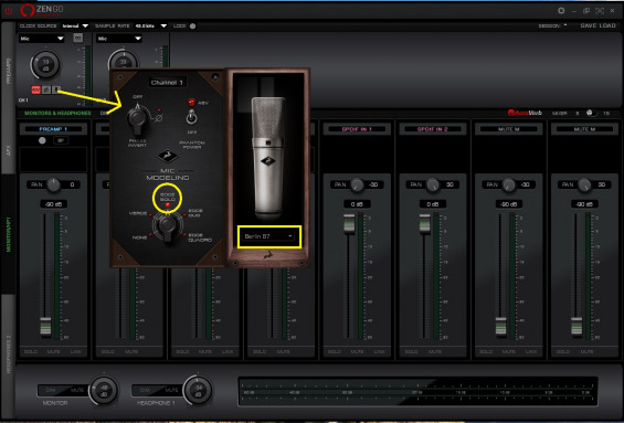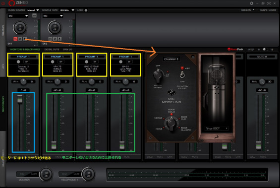 Zen GO SCはUAD社のオーディオインターフェイスと同じく「持ち歩けない機材」をシミュレートしたプラグインをオーディオインターフェイス本体に憑依させて使用することができます。