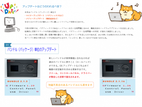 上位機の更新仕様はわかりませんが、本機を購入後2回のバンドル更新がランチャーアプリより行われましたので、更新の方法を確認してみました。Zen GO SCのバンドル(パッケージ)更新は以下のイメージのようにファームウェア、コントロールパネル、USBドライバーがセットで行われる仕組みになっているようですね。